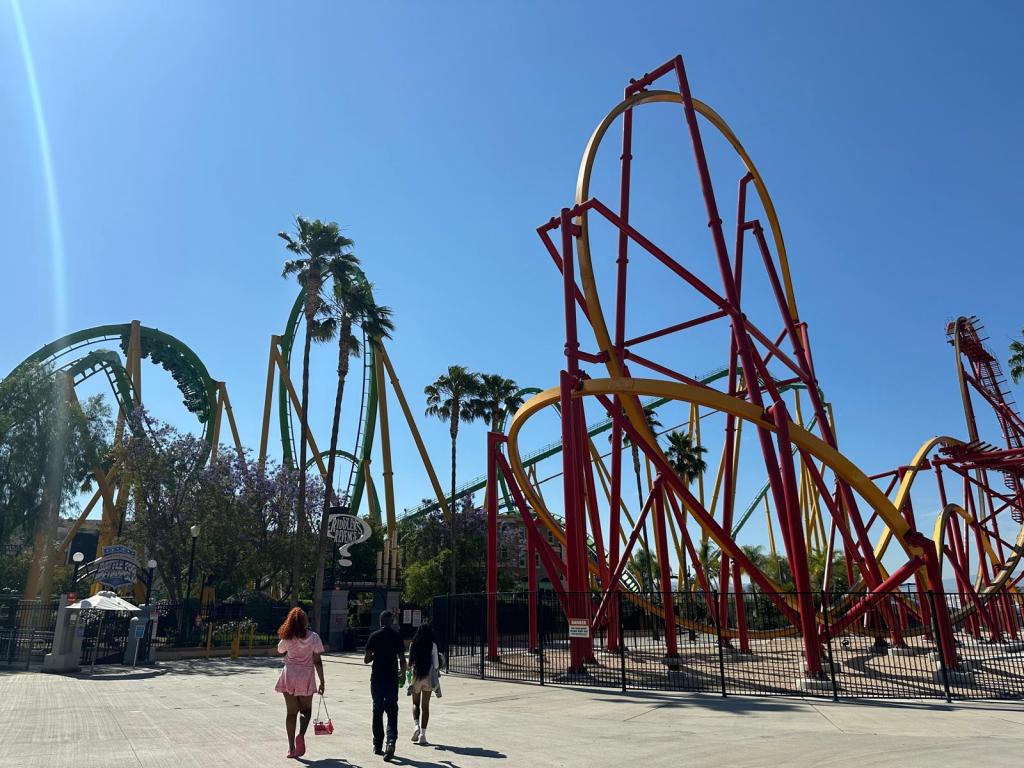 On Sunday we went to Six Flags Magic Mountain theme park. I’m not a huge fan of roller coasters, so I went on some of the gentler rides whilst the boys did all the big coasters. We went on a few all together though; Ralph got soaked on the River Rapids, we got thoroughly rattled around on a rickety wooden coaster called Apocalypse, and my favourite was a ride called Ninja where you sit in a carriage almost like a ski-lift gondola, which is suspended from a track above – the carriages then swing up to 90 degrees each way! We were there from just after the park opened until it closed, then we headed to one of our favourite restaurants for dinner which specialises in schnitzel and German beer.