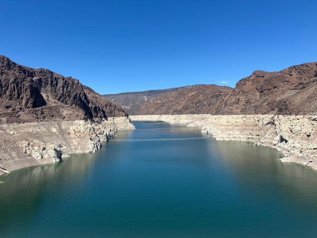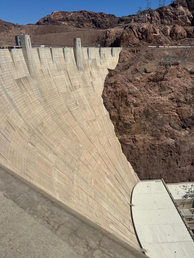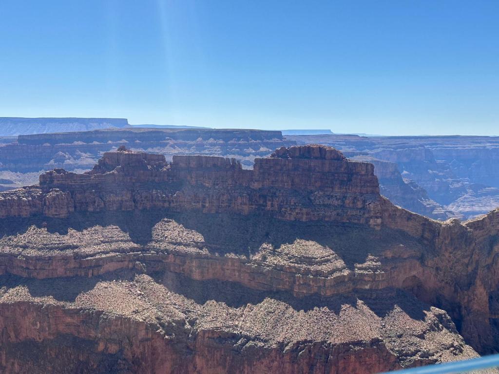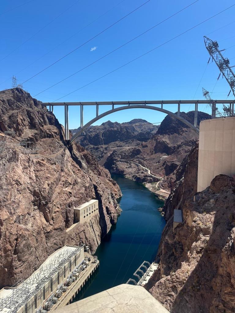 On Sunday we had a steady start to the day and went for brunch at a French restaurant in the Paris hotel, before continuing our road trip. We stopped again at The Hoover Dam and Lake Mead. We hadn’t realised our route would take us across the bridge next to the Hoover Dam so this was an unexpected bonus to our trip. The dam was narrower but much higher than I had expected, and the water level was quite low to the north of the dam (as you would expect after weeks of intense heat and no rain). The state border between Nevada and Arizona passes through the middle of the dam and there are clocks either side labelled ‘Nevada Time’ and ‘Arizona Time’. The states are in the same time zone though so they read the same! After taking many many pictures, we kept driving until we reached our destination around 6.30 pm – Grand Canyon West. We had booked a cabin to stay over night on the Hualapai Ranch, but when we checked in they said the on-site restaurant had already closed for the night, so we got back in the car to drive to a ranch with western decor which we had passed along the way for dinner. This was another unexpected gem with great food at reasonable prices and a great view of the sunset. It was so peaceful staying in the cabin, with incredible views of the stars overhead.