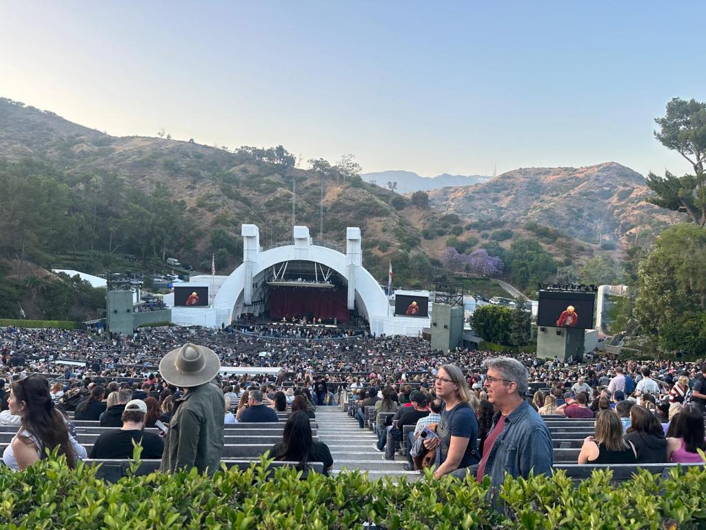 On Thursday we visited the Academy Museum of Motion Pictures. A new exhibition had opened since I last went, all about production design and set dressing, focusing on Disney’s Beauty and The Beast from 2017, and Barbie from 2023. I also spent more time in an exhibition about the origins of the Hollywood studios and production companies, many of which were founded by Jewish individuals or families, which was very interesting. In the evening, Chris and I went to see Mumford and Sons at The Hollywood Bowl (Ralph kindly dropped us off and picked us up) – I’ve wanted to see Mumford and Sons play for a long time as I love several of their songs, but they took a break from touring to work on new music. It’s an amazing venue as well! Like an amphitheatre with wooden benches, surrounded by the Hollywood Hills! Then on Friday we went to the Gagosian Art Gallery in Beverly Hills which is still showing an exhibition of photography by Paul McCartney in 1963 and 1964.